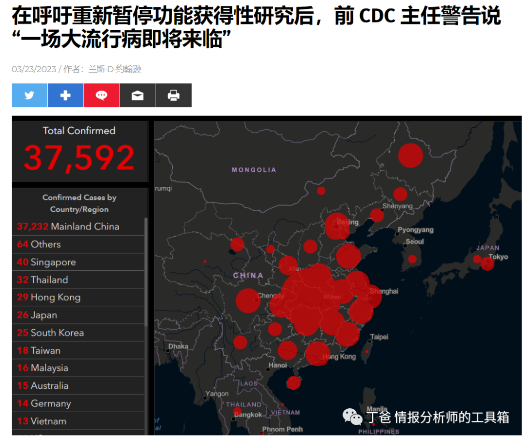 美国CDC 前主任罗伯特·雷德菲尔德 (Robert Redfield) 博士最近在 Hill.TV 的一集节目中警告说:“一场大流行病即将来临”。他说,新的大流行将是国际生物恐怖主义和功能获得研究的结果,尽管被认为是 covid-19 的原因,但这种研究仍在继续。