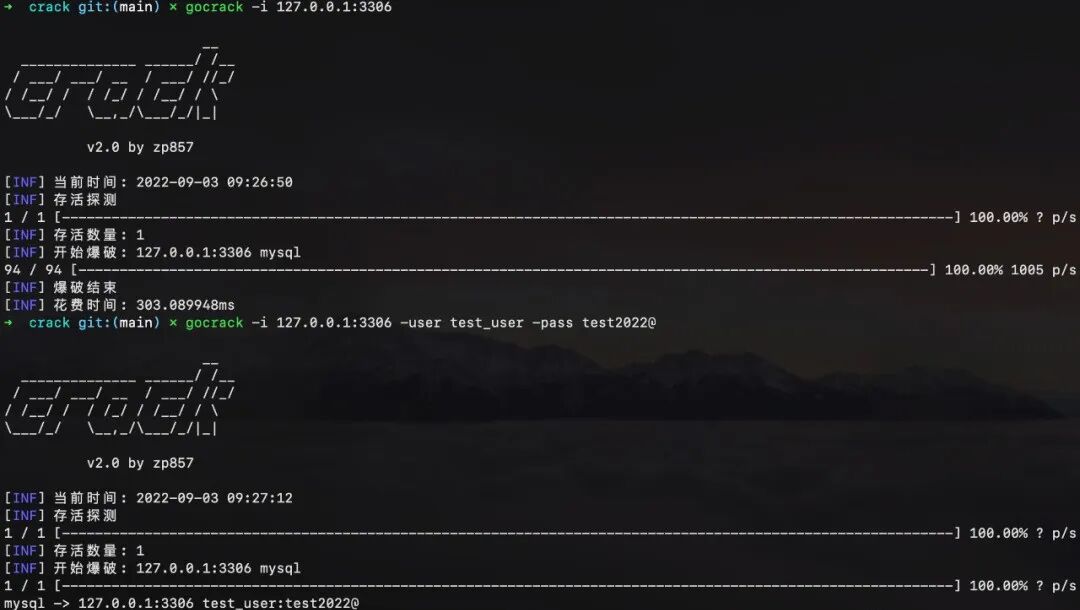 ➜ crack ./crack -hService crackerUsage:./crack [flags]Flags:INPUT:-i, -input string crack service input(example: -i '127.0.0.1:3306', -i '127.0.0.1:3307|mysql')-f, -input-file string crack services file(example: -f 'xxx.txt')-m, -module string choose one module to crack(ftp,ssh,wmi,mssql,oracle,mysql,rdp,postgres,redis,memcached,mongodb) (default "all")-user string user(example: -user 'admin,root')-pass string pass(example: -pass 'admin,root')-user-file string user file(example: -user-file 'user.txt')-pass-file string pass file(example: -pass-file 'pass.txt')CONFIG:-threads int number of threads (default 1)-timeout int timeout in seconds (default 10)-delay int delay between requests in seconds (0 to disable)-crack-all crack all user:passOUTPUT:-o, -output string output file to write found results (default "crack.txt")-nc, -no-color disable colors in outputDEBUG:-silent show only results in output-debug show debug output