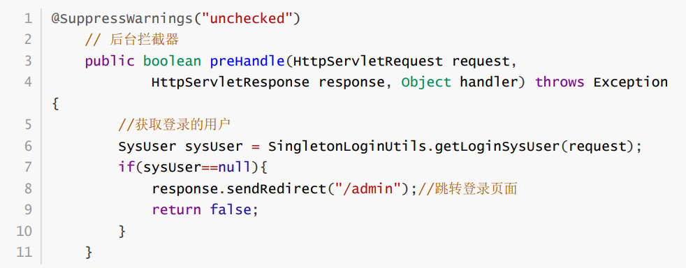 通过SingletonLoginUtils.getLoginSysUser方法获取到用户后,对用户进行判断。如果用户为空则直接跳转到登录页面。