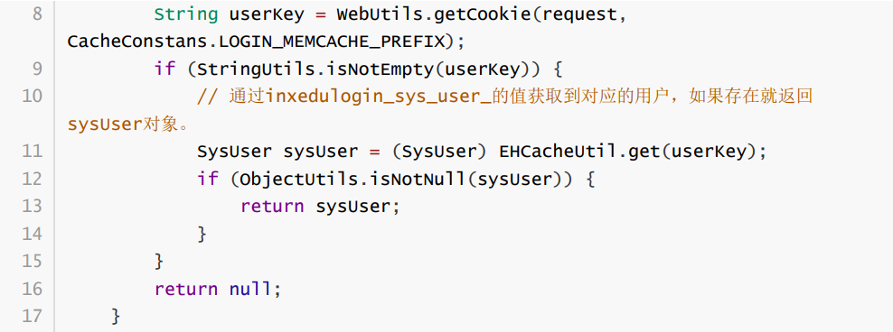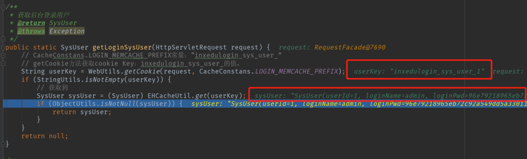 这里通过传进来的实参 key 从cache对象里面获取到用户的,前面说到web应用重启后无法直接用cookie未授权访问是因为需要有用户登录过后会把用户对象存到cache对象里面,才能再后注入cookie:inxedulogin_sys_user_:inxedulogin_sys_user_1去未授权访问,且后面cookie值后面这个1是对应的数据库里面 sys_user表用户的id,这里还存在一个越权的问题,可通过遍历ID来登录到不同用户的后台。