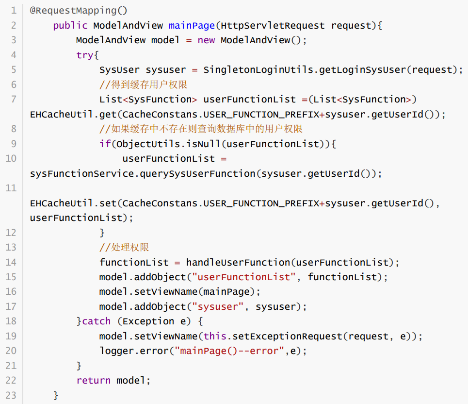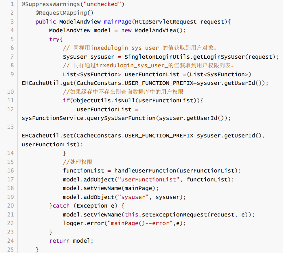 demo_inxedu_open\src\main\java\com\inxedu\os\edu\controller\main\MainController.java这里可看到Controller里面未对用户是否已登录做任何判断,直接就是获取当前用户权限的逻辑。所以可推测在这之前有使用到Filter或者拦截器对用户是否已登录做判断。