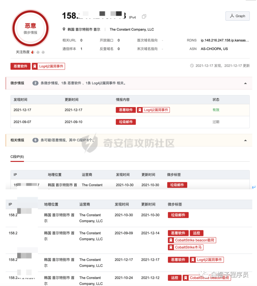 通过查询158.x.x.x的威胁情报,发现存在恶意攻击历史活动,符合黑产相关特征,可作为后续追查的切入点和参考;