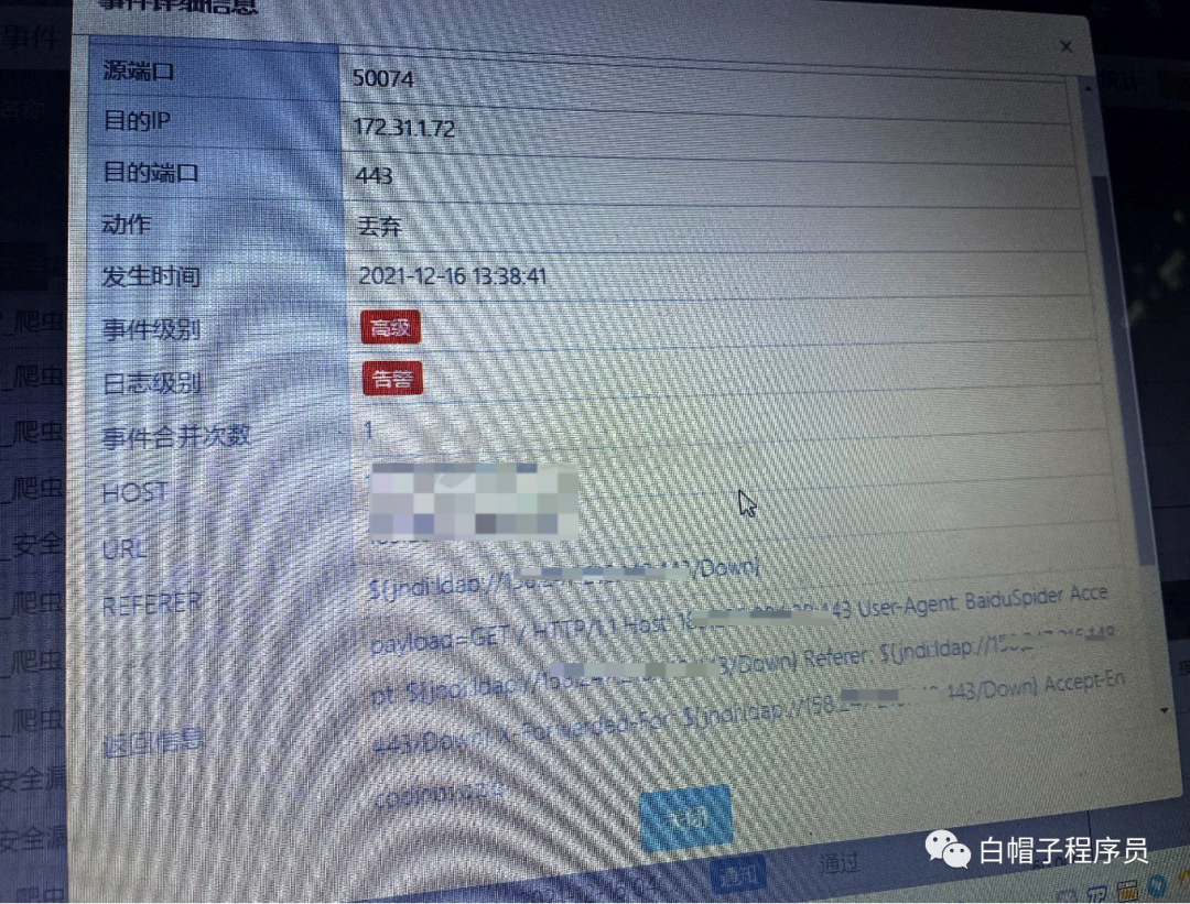 此时有同事在防火墙事件信息中发现有利用log4j攻击行为,防火墙的动作是丢弃并未进行拦截。
