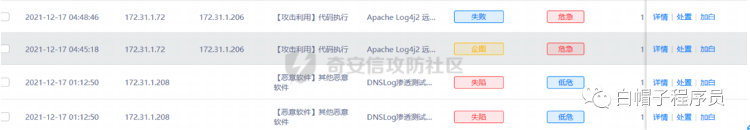 3、随后将互联网全面开通,业务恢复正常运行,同时部署态势感知设备,待设备经过流量、漏洞测试后,发现可有效监测log4j漏洞攻击,由此开展实施监控。