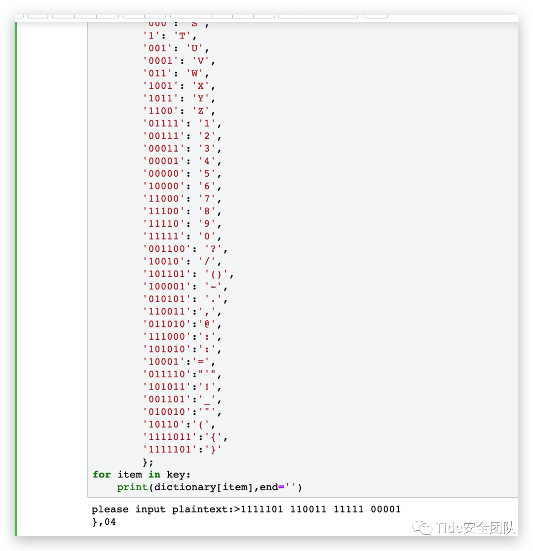 string=input('please input plaintext:>')key=string.split(" ")dictionary= {'01': 'A','1000': 'B','1010': 'C','100':'D','0':'E','0010':'F','110': 'G','0000': 'H','00': 'I','0111':'J','101': 'K','0100': 'L','11': 'M','10': 'N','111': 'O','0110': 'P','1101': 'Q','010': 'R','000': 'S','1': 'T','001': 'U','0001': 'V','011': 'W','1001': 'X','1011': 'Y','1100': 'Z','01111': '1','00111': '2','00011': '3','00001': '4','00000': '5','10000': '6','11000': '7','11100': '8','11110': '9','11111': '0','001100': '?','10010': '/','101101': '()','100001': '-','010101': '.','110011':',','011010':'@','111000':':','101010':':','10001':'=','011110':"'",'101011':'!','001101':'_','010010':'"','10110':'(','1111011':'{','1111101':'}'};for item in key:print(dictionary[item],end='')