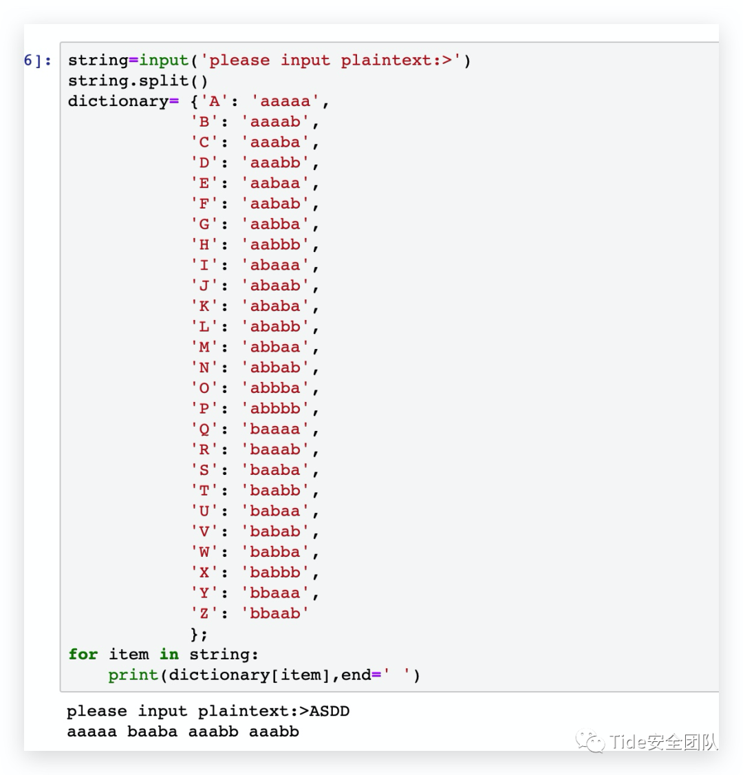 string=input('please input plaintext:>')string.split()dictionary= {'a': 'AAAAA','g': 'AABBA','n': 'ABBAA','t': 'BAABA','b': 'AAAAB','h': 'AABBB','o': 'ABBAB','u': 'BAABB','v': 'BAABB','c': 'AAABA','i': 'ABAAA','j': 'ABAAA','p': 'ABBBA','w': 'BABAA','d': 'AAABB','k': 'ABAAB','q': 'ABBBB','x': 'BABAB','e': 'AABAA','l': 'ABABA','r': 'BAAAA','y': 'BABBA','f': 'AABAB','m': 'ABABB','s': 'BAAAB','z': 'BABBB'};for item in string:print(dictionary[item],end=' ')