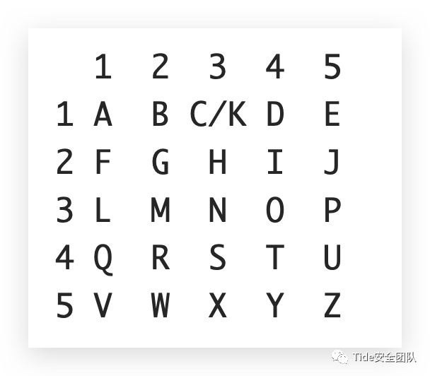 敲击码是基于5×5方格波利比奥斯方阵来实现的,不同点是是用K字母被整合到C中。