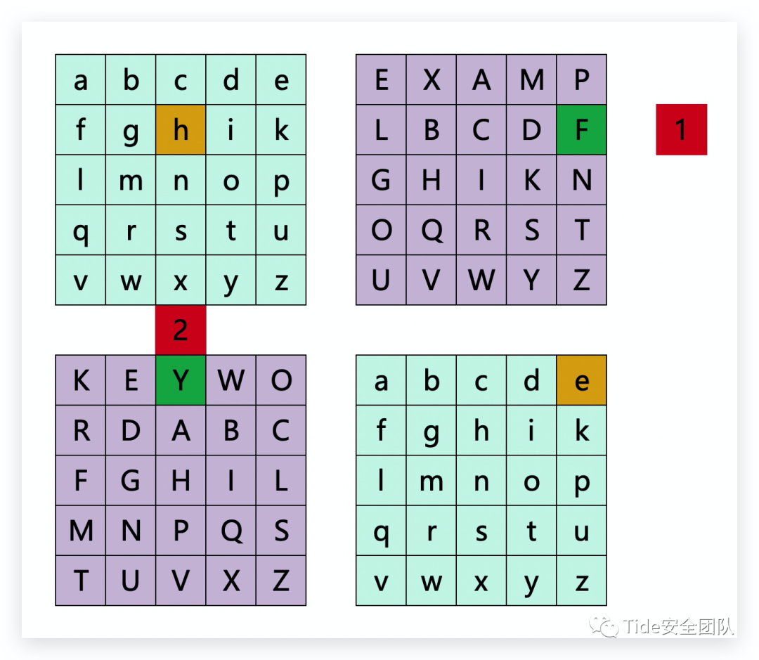 找右上角矩阵中,和第一个字母同行,第二个字母同列的字母