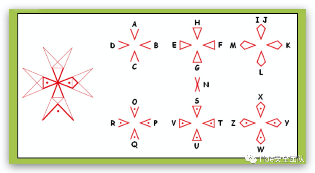 它由四个箭头形状组成,圣堂武士用三角形和圆点组合了25个符号,指向十字箭头的四个方向。