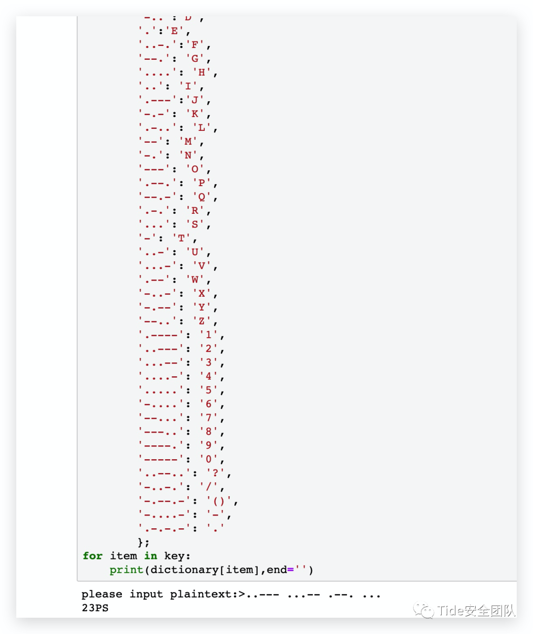 string=input('please input plaintext:>')key=string.split(" ")dictionary= {'.-': 'A','-...': 'B','-.-.': 'C','-..':'D','.':'E','..-.':'F','--.': 'G','....': 'H','..': 'I','.---':'J','-.-': 'K','.-..': 'L','--': 'M','-.': 'N','---': 'O','.--.': 'P','--.-': 'Q','.-.': 'R','...': 'S','-': 'T','..-': 'U','...-': 'V','.--': 'W','-..-': 'X','-.--': 'Y','--..': 'Z','.----': '1','..---': '2','...--': '3','....-': '4','.....': '5','-....': '6','--...': '7','---..': '8','----.': '9','-----': '0','..--..': '?','-..-.': '/','-.--.-': '()','-....-': '-','.-.-.-': '.'};for item in key:print(dictionary[item],end='')