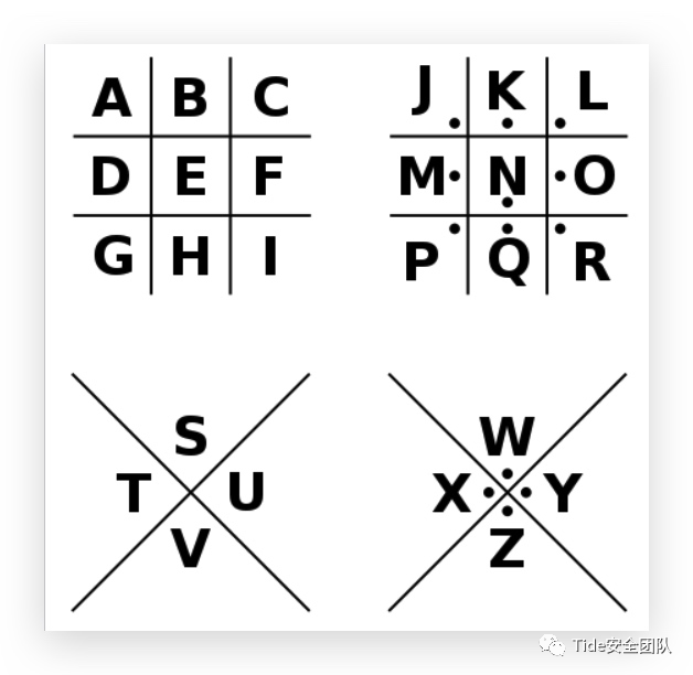 字母表中除了J之外的每个字母都用一种容易记住的模式替换了其中一个符号。