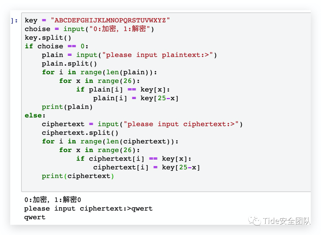 key = "ABCDEFGHIJKLMNOPQRSTUVWXYZ"choise = input("0:加密,1:解密")key.split()if choise == 0:plain = input("please input plaintext:>")plain.split()for i in range(len(plain)):for x in range(26):if plain[i] == key[x]:plain[i] = key[25-x]print(plain)else:ciphertext = input("please input ciphertext:>")ciphertext.split()for i in range(len(ciphertext)):for x in range(26):if ciphertext[i] == key[x]:ciphertext[i] = key[25-x]print(ciphertext)