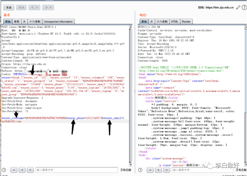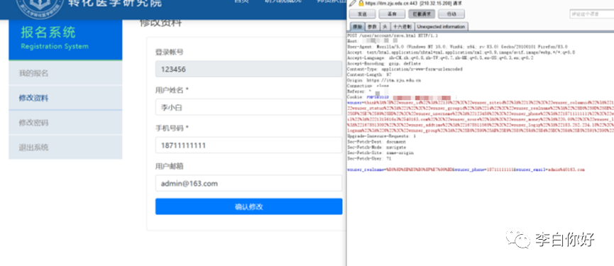 水平越权逻辑缺陷,鉴权过于简单,phpsession作用几乎形同虚设,和案例一一样,你需要注册两个账号,修改资料处抓包