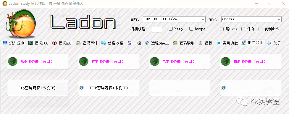 不熟悉Ladon命令的,可以使用Ladon Study一键使用,可当作学习模式。勾选复制命令,点击按钮就会执行对应功能,并在后台复制对应Ladon命令,可直接在CMD粘贴使用。对于监听模块,监听端口可写在目标文本框中。