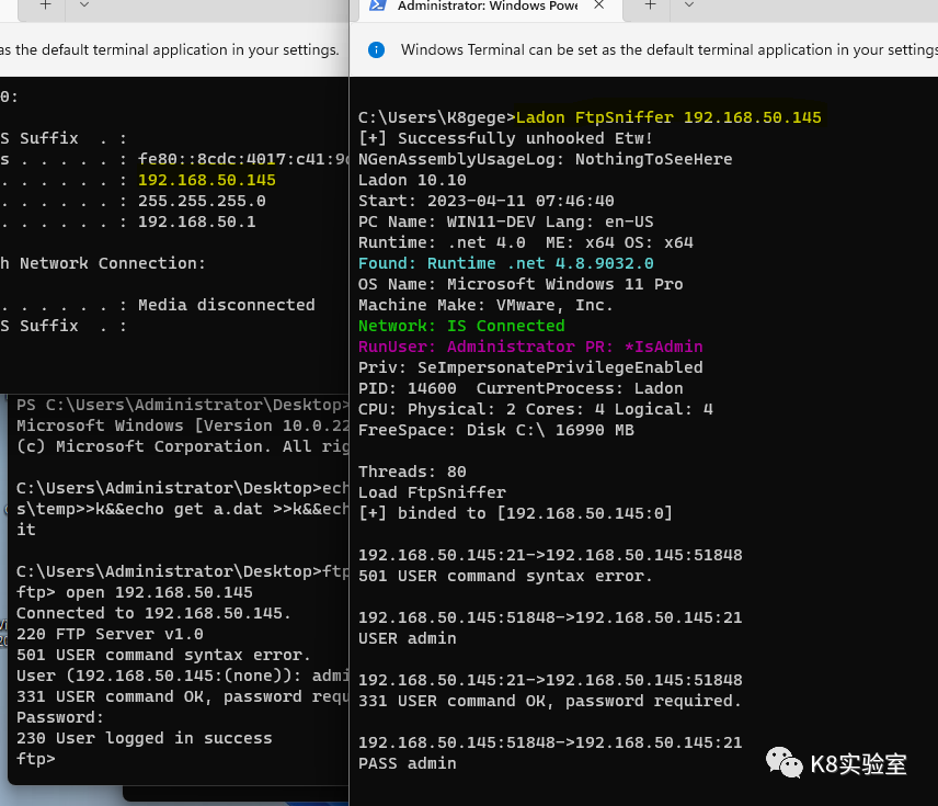 Ladon FtpSniffer 192.168.50.145使用时填写被控机器IP,Ladon自动嗅探本机C段所有机器FTP用户密码,如下图演示,本机为50.145,无论是从50.85访问50.145,还是从本机自己访问自己,都能捕获到FTP登陆的用户和密码。实战中,如果管理员从50.200访问外网FTP服务器或者访问跨网段FTP服务器,也能捕获到外网FTP用户密码。因为捕获的是整个C段的FTP流量,向外发现,或者其它人访问C段机器。