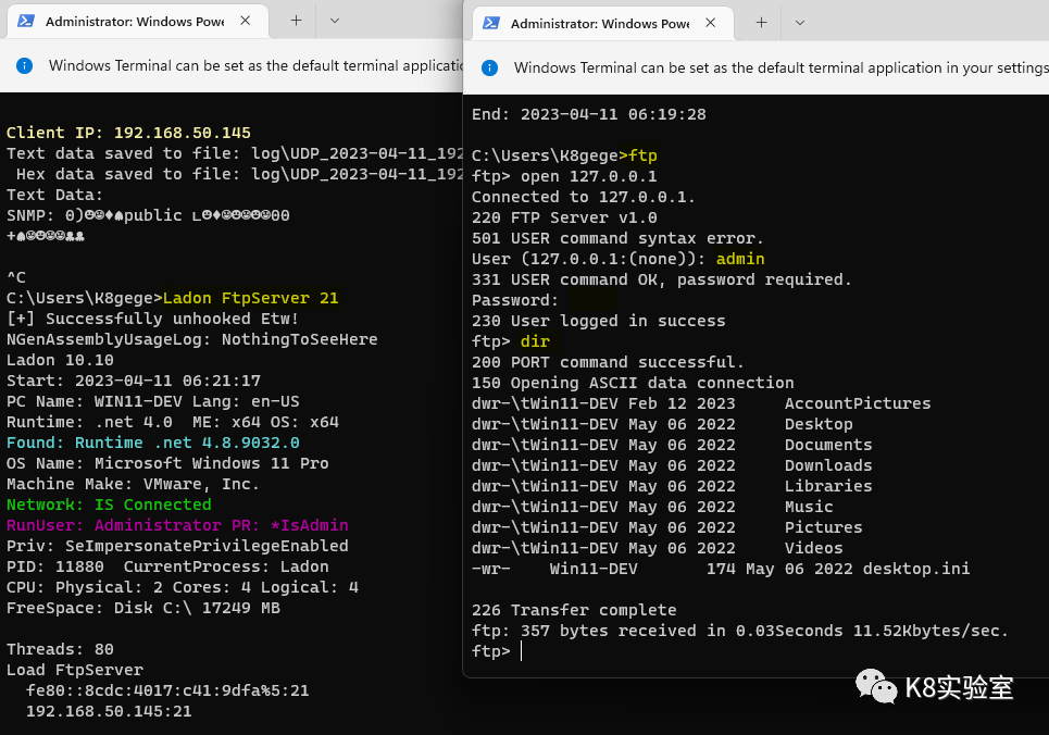 图片演示使用windows系统连接列目录,实战自行将ftp转成一条命令,实现一键上传下载文件,当然下载也可以使用Ladon的web服务器,curl等命令比ftp更简单。