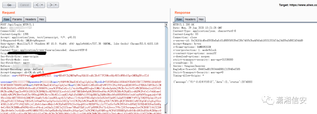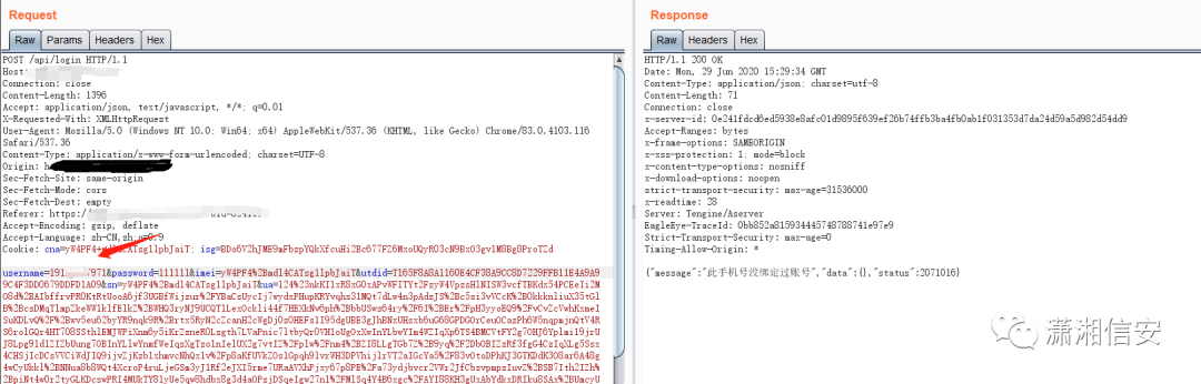 登入处抓包,发现这里存在一个账号枚举,发现通过爆破不同的username,即通过遍历手机号码得知该手机号码是否在该业务上注册过。