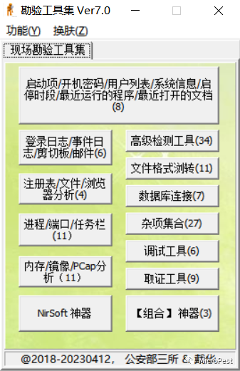 这是我的勘验工具包,从2018年起第一版一直在维护中,到5月1日就满5整年了,昨天晚上值班,花了4个小时,一直忙到凌晨2点才将程序、工具大梳理、大清理、大归类完毕。原来有些乱的地方面貌一新,做到了底数清、情况明,对每个版块的工具进行了再梳理,在程序界面上标明了版块内工具的数量,所有程序进行了更新,其中包括我自己开发的一些小工具,基本达到了最新版本。