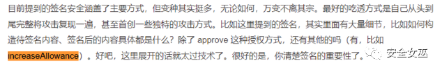 有人会上当估计也是因为:大家可能习惯了授权(approve)钓鱼这种常规风险,但对于超出 approve 这类方式的提醒就不一定理解了,其实除了 increaseAllowance 还有permit 等等,更别提低级签名、盲签、多协议组合操作等签名方式了。
