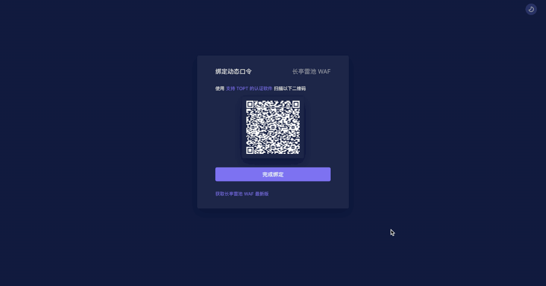 浏览器打开后台管理页面 https://<waf-ip>:9443。根据界面提示,使用 「支持 TOPT 的认证软件」 扫描二维码,然后输入动态口令登录: