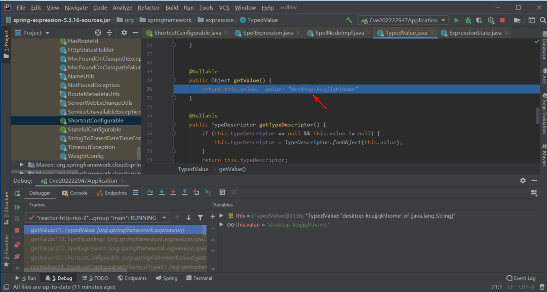 继续跟进该方法,TypedValue typedResultValue = this.ast.getTypedValue(expressionState); 返回执行结果。