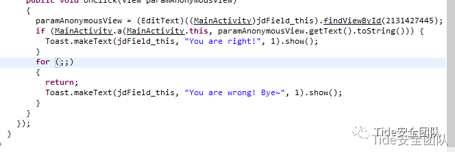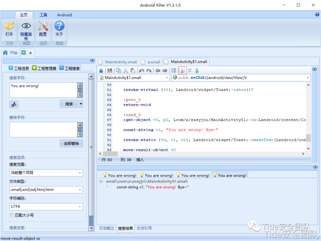 反编译完成后搜索“You are wrong! bye~”字符串,发现位于MainActivity