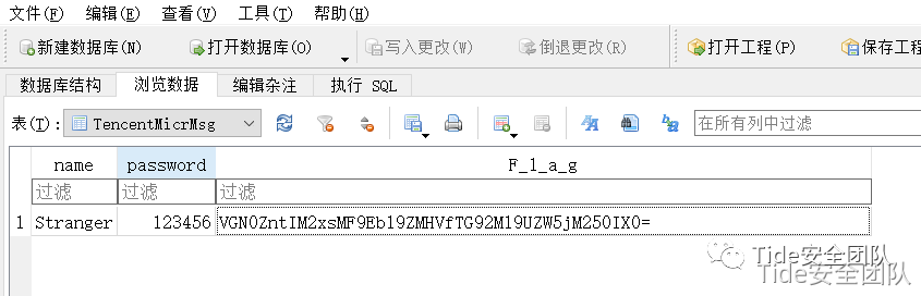 使用DB Browser for SQLite打开加密的数据库文件Encryto.db,浏览数据发现base64字符串,解密后获得flag