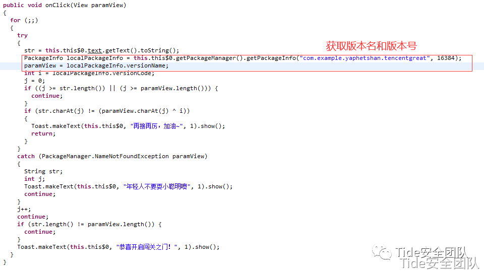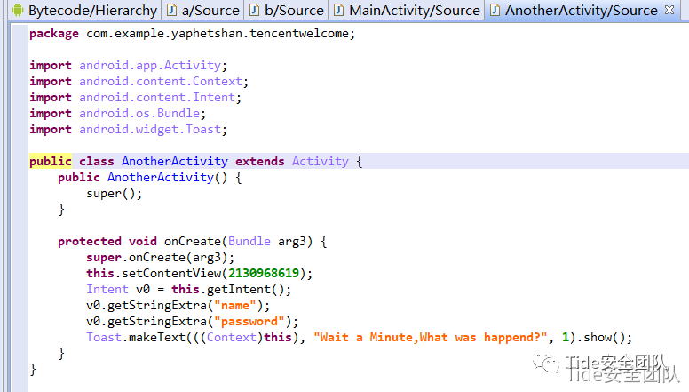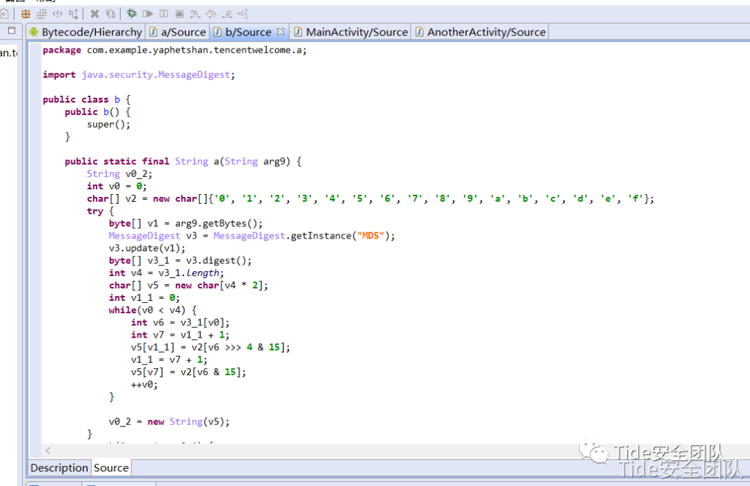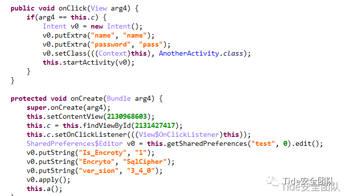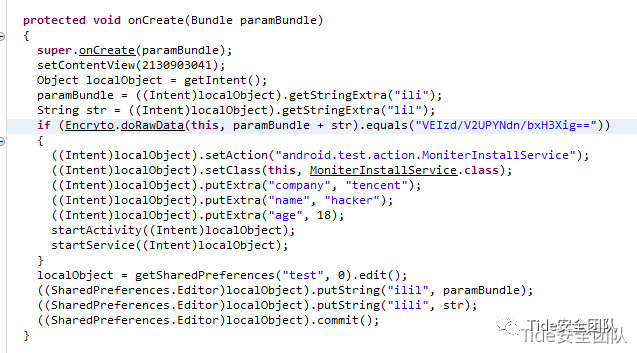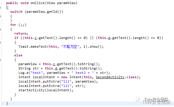 对源码进行分析可看出在onClick()类中变量c、d获取了文本框中的输入保存为ili传入了SecondActivity。跟进SecondActivity,在onCreate中取出了ili字符串并对其进行了加密与另一加密字符串进行对比