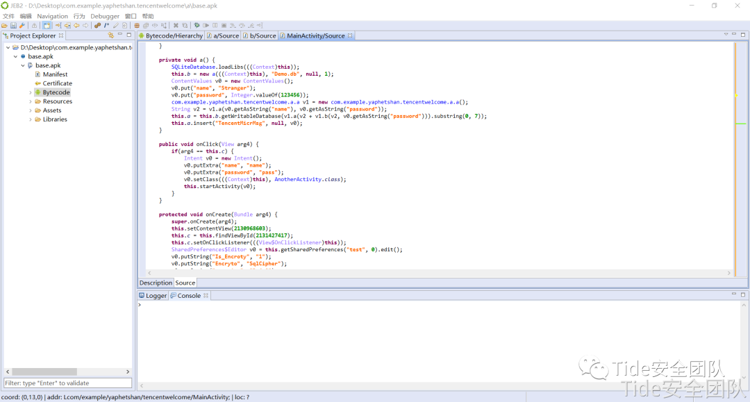 使用JEB2进行逆向进行逆向找到入口程序MainActivity反编译查看源码