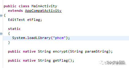 在MainActivity中首先导入了名为“phcm”的so文件,接着使用两个native方法