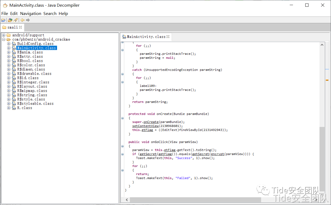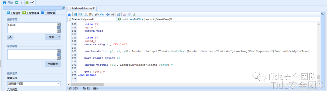 反编译完成后搜索“Failed”定位到MainActivity.samli
