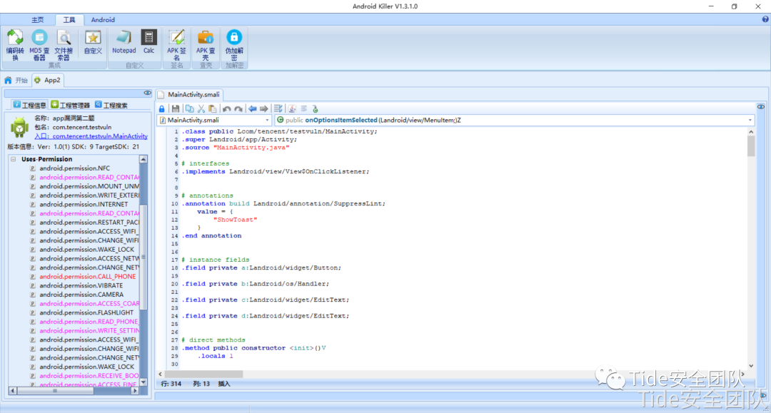 将安装包丢入Android Killer进行逆向,逆向完毕找到入口函数进行反编译查看源代码