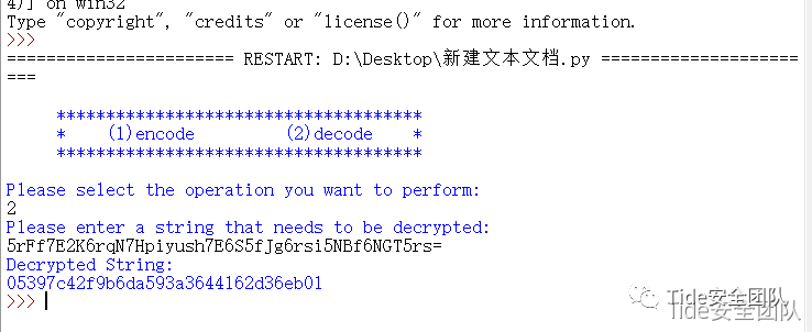 # coding:utf-8# s = "ABCDEFGHIJKLMNOPQRSTUVWXYZabcdefghijklmnopqrstuvwxyz0123456789+/"s = "vwxrstuopq34567ABCDEFGHIJyz012PQRSTKLMNOZabcdUVWXYefghijklmn89+/"def My_base64_encode(inputs):# 将字符串转化为2进制bin_str = []for i in inputs:x = str(bin(ord(i))).replace('0b', '')bin_str.append('{:0>8}'.format(x))#print(bin_str)# 输出的字符串outputs = ""# 不够三倍数,需补齐的次数nums = 0while bin_str:#每次取三个字符的二进制temp_list = bin_str[:3]if(len(temp_list) != 3):nums = 3 - len(temp_list)while len(temp_list) < 3:temp_list += ['0' * 8]temp_str = "".join(temp_list)#print(temp_str)# 将三个8字节的二进制转换为4个十进制temp_str_list = []for i in range(0,4):temp_str_list.append(int(temp_str[i*6:(i+1)*6],2))#print(temp_str_list)if nums:temp_str_list = temp_str_list[0:4 - nums]for i in temp_str_list:outputs += s[i]bin_str = bin_str[3:]outputs += nums * '='print("Encrypted String:\n%s "%outputs)def My_base64_decode(inputs):# 将字符串转化为2进制bin_str = []for i in inputs:if i != '=':x = str(bin(s.index(i))).replace('0b', '')bin_str.append('{:0>6}'.format(x))#print(bin_str)# 输出的字符串outputs = ""nums = inputs.count('=')while bin_str:temp_list = bin_str[:4]temp_str = "".join(temp_list)#print(temp_str)# 补足8位字节if(len(temp_str) % 8 != 0):temp_str = temp_str[0:-1 * nums * 2]# 将四个6字节的二进制转换为三个字符for i in range(0,int(len(temp_str) / 8)):outputs += chr(int(temp_str[i*8:(i+1)*8],2))bin_str = bin_str[4:]print("Decrypted String:\n%s "%outputs)print()print(" *************************************")print(" * (1)encode (2)decode *")print(" *************************************")print()num = input("Please select the operation you want to perform:\n")if(num == "1"):input_str = input("Please enter a string that needs to be encrypted: \n")My_base64_encode(input_str)else:input_str = input("Please enter a string that needs to be decrypted: \n")My_base64_decode(input_str)