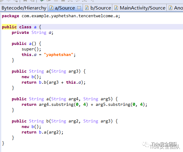 a、b两个类中程序的逻辑为将Stranger和123456两个字符串取前四个,并拼接到一起,得到Stra1234将Stra1234进行md5加密后用base16加密,得到的字符串前面加上Stra1234,在拼接上字符串yaphetshan后用SHA-1加密,在用base16加密,最后取得到字符串的前七位