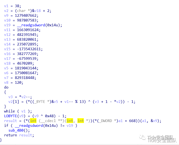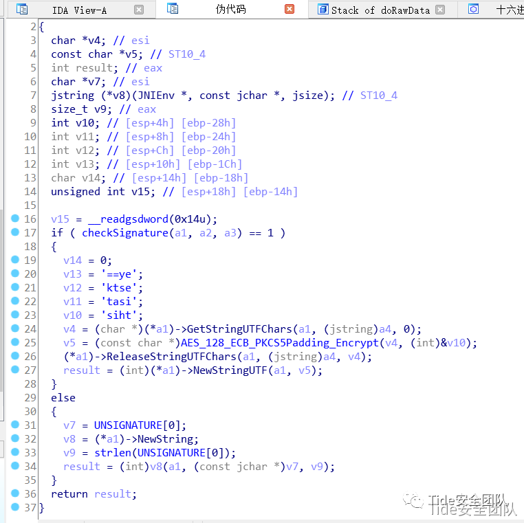 可以看到v14-v10这里组成了个数组,我们将其取出。秘钥为“thisisatestkey==”,