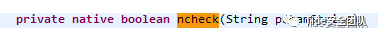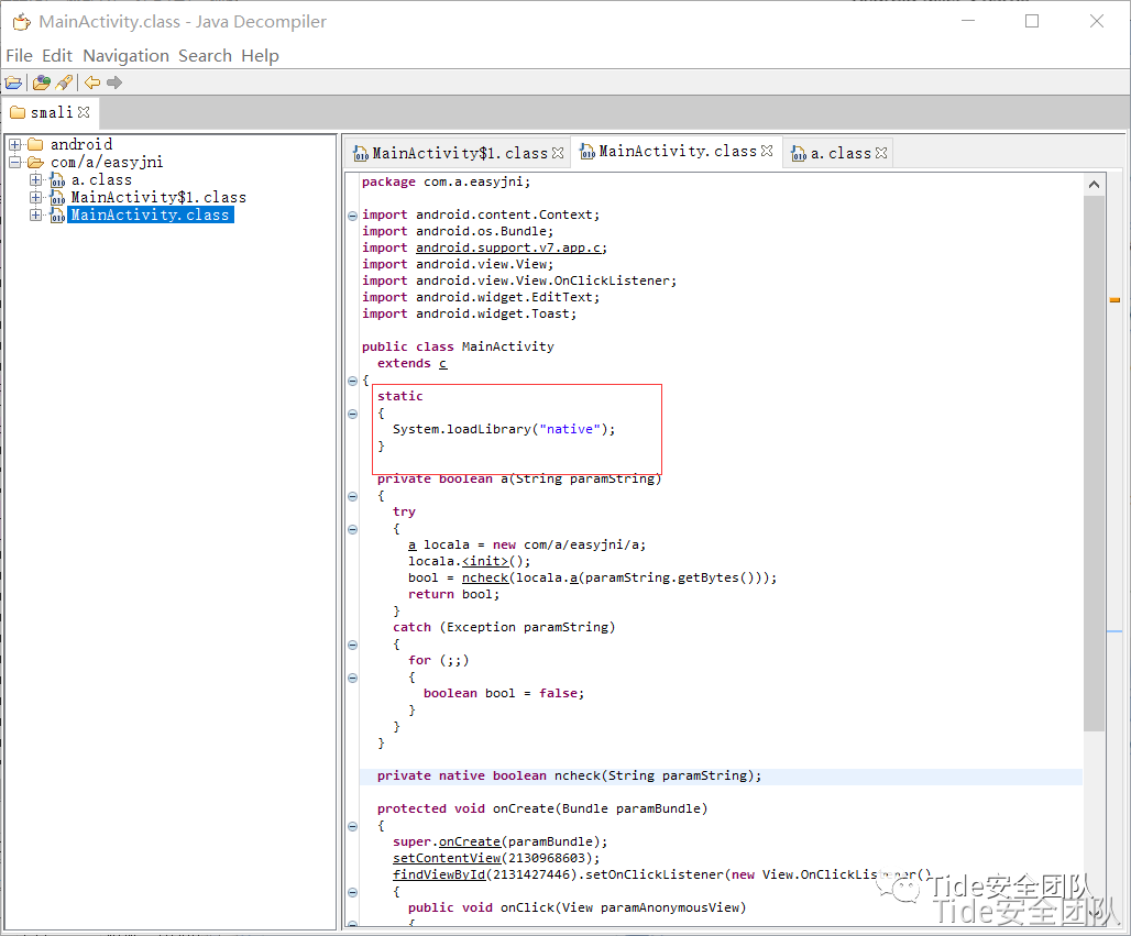在MainActivity中首先导入了名为“native”的so文件,然后在“You are wrong! bye~”处,程序首先将输入框得到的字符串与MainActivity.this属性作为参数,调用MainActivity中的a方法返回的布尔值作为是否通关条件的。