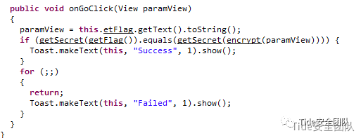 程序中在if判断中前后都调用getSecret方法,通过判断参数相等即可。也就是说getFlag()=encrypt(paraView)其中paraView是我们的输入的字符串