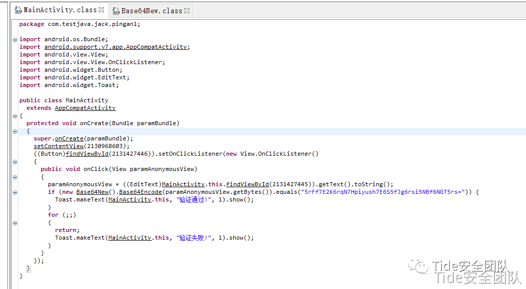 从代码中可以看出逻辑为,对输入的内容调入Base64New类进行加密,加密后的结果与“5rFf7E2K6rqN7Hpiyush7E6S5fJg6rsi5NBf6NGT5rs=”进行对比,相同则提示验证通过,不同则验证失败