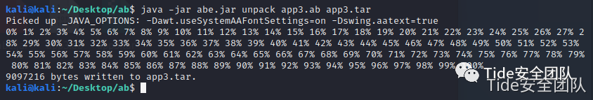 java -jar abe.jar unpack app3.ab app3.tar使用该工具从app3.ab提取出app3.tar,解压app3.tar,得到一个base.apk和Demo.db、Encryto.db
