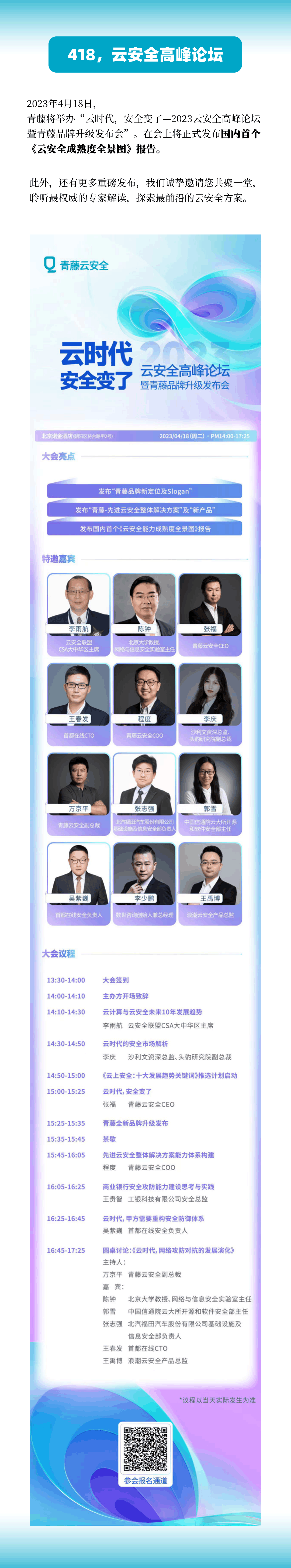 2023年4月18日,青藤将举办“云时代,安全变了——2023云安全高峰论坛暨青藤品牌升级发布会”。