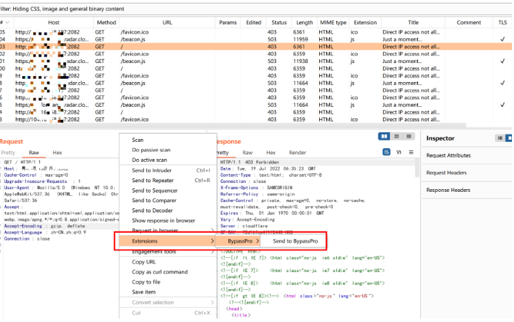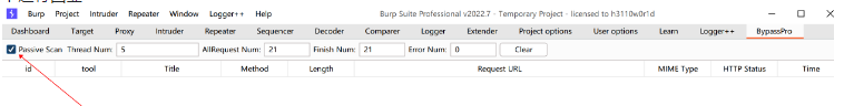 1、被动扫描:勾选上之后,proxy 流量中出现403 301 404 302 的时候去自动bypass 主动扫描:取消勾选之后,可以在proxy 流量中选择一些右键发送到BypassPro 去自动fuzz 当状态码是200,415,405则会进行回显,页面相似度80%以下进行回显
