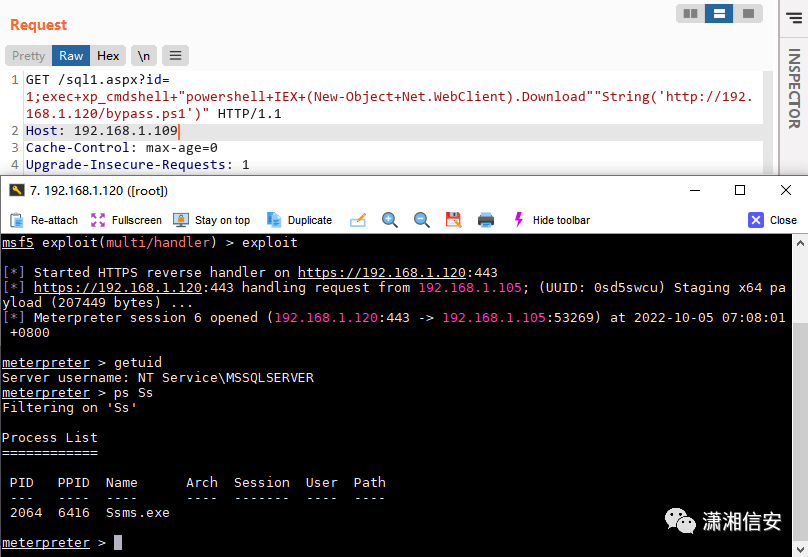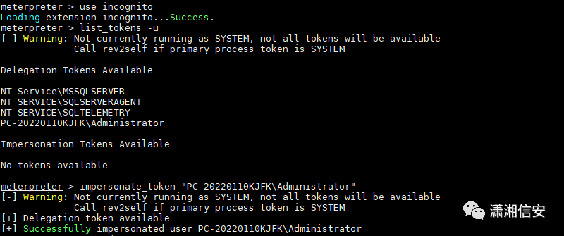 首先我们利用以上参考文章中的绕过方式获取一个Meterpreter会话,如果进程列表有Ssms.exe进程则大概率可以使用Incognito扩展中的模拟令牌功能提权。