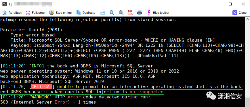 而且这台数据库服务器上不存在Web,所以也不能写入Webshell;找到了后台地址,但在sqlmap中没有找到管理员和用户表,直接执行os-shell会出现下图报错,提示不支持堆叠查询...!