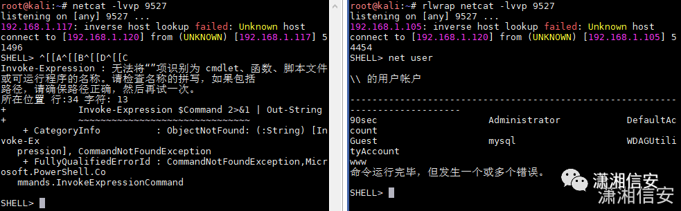 ↑↓←→等特殊按键乱码问题,我们可以尝试使用rlwrap工具来解决这个问题。(2) 执行powercat反弹shell时发现限制了字符长度,这里我们可以尝试用短域名,或者是修改文件名和函数名,这里我将文件名改为1.ps1,函数名改为f。