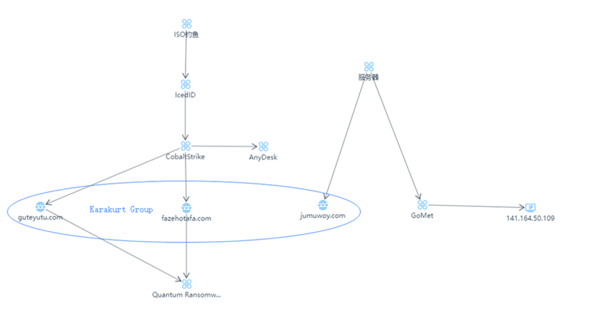 值得一提的是,我们在有些现场发现了Karakurt Group留下的勒索信,这从侧面印证了Karakurt Group曾经与Conti Group存在合作,国外研究人员认为Karakurt Group作为Conti Group的红队专门用来渗透攻击,基于我们观察到的案例,Conti 相关的勒索事件中所用的手法和C2基础设施确实与Karakurt Group有着很深的关联,由于Conti Group已经解散,无法获得更多有价值的信息。但我们观察到新兴的Quantum勒索软件似乎与Karakurt Group有着比较深的联系。
