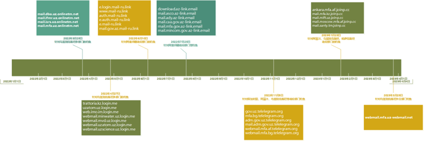 在2022及2023年期间,研究人员监测到某未知组织针对东欧及中东、中亚部分国家的攻击行动并进行了披露(由于其使用了LodaRAT,前期披露文章将其与Kasablanka进行关联,通过更深度的判断分析确认其为新组织),该组织最早攻击行动可追溯到2022年3月份,接近俄乌战争开始时间(2022年2月),结合其攻击目标分析,可初步判断该组织是由于俄乌战争而催生出的网络间谍组织。该组织主要活跃于东欧及中亚地区,将其命名为WarSunflower(战争葵花)以代表其产生来源于俄乌战争,外部友商将该组织命名为“APT-LY-1006”、“YoroTrooper”。除了通过钓鱼窃取邮箱凭证外,该组织还投递多种木马对目标进行攻击(主要投递的载荷为vhdx文件,并且vhdx里包含后门组件或LNK文件下载器及诱饵文件等)。下图为该组织的相关钓鱼攻击行动时间线。